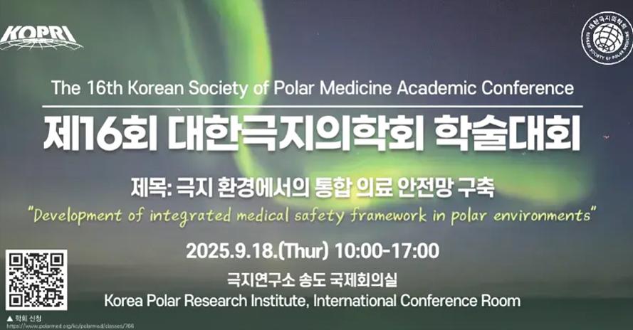 외부보도2025.09.04'극지 환경에서의 통합 의료 안전망 구축' 제16회 대한극지의학회 학술대회 개최된다AI 디지털 헬스케어와 극지안전정책의 융합...극지 의료체계 통합 관리 극지의료지원센터 설립 제안 .. -