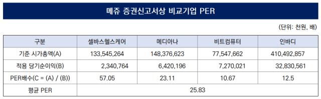 시장에서 메쥬와 가장 유사한 기업으로 보는 코스닥 상장사는 웨어러블 진단 모니터링 기업인 씨어스테크놀로지다. 기술 구현 방식에 차이가 있지만 공략하는 시장이 중복된다. 이 회사는 지난 2024년 상장 이후 지속적으로 주가가 우상향하며 현재 시가총액이 1조6000억원을 상회하고 있다. 하지만 아직 이익이 발생하지 않고 있어 최종 피어그룹에서 제외됐다.